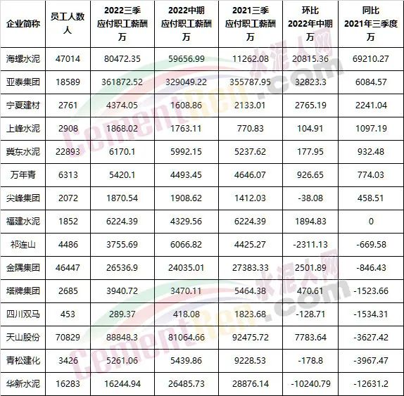 從上市公司三季度未應付職工薪酬可見,天山股份70829名員,2022年三季應付薪酬達88848.3萬;海螺水泥47014應付薪酬達80472.35萬;金隅集團46447人應付薪酬達26536.9萬。