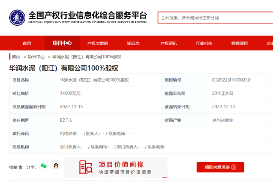 11月15日,全國(guó)產(chǎn)權(quán)行業(yè)信息化綜合服務(wù)平臺(tái)披露華潤(rùn)水泥控股(香港)有限公司(以下簡(jiǎn)稱“華潤(rùn)水泥控股(香港)”)掛牌轉(zhuǎn)讓華潤(rùn)水泥(陽(yáng)江)有限公司(以下簡(jiǎn)稱“華潤(rùn)水泥(陽(yáng)江)”)100%股權(quán),轉(zhuǎn)讓底價(jià)3.45億元,信息披露起止日為2022年11月15日至2022年12月12日。