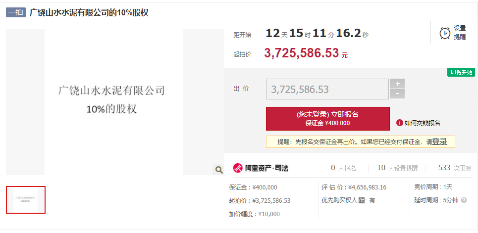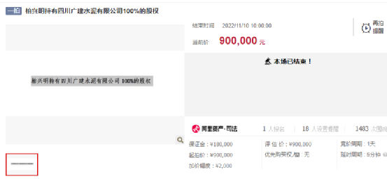 水泥人網(wǎng)注意到于11月10日10時(shí)結(jié)束的“柏興明持有四川廣建水泥有限公司100%的股權(quán)”公開(kāi)拍賣,當(dāng)前價(jià)為90萬(wàn)元。