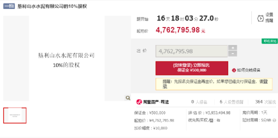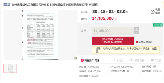 拍賣標(biāo)的為被執(zhí)行人貴州鑫晟煤化工有限公司持有的水城海螺盤(pán)江水泥有限責(zé)任公司15%股權(quán)。起拍價(jià):3410.5萬(wàn)元,保證金:200萬(wàn)元,增價(jià)幅度:10000元。