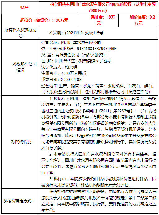 四川省成都市中級(jí)人民法院發(fā)布的公告文件中提到,拍賣標(biāo)的“興明持有四川廣建水泥有限公司100%的股權(quán)”為涉案財(cái)產(chǎn),起拍價(jià)為90萬(wàn)元。