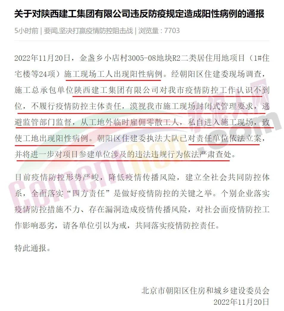 11月20日,據(jù)北京市朝陽區(qū)住建委通報,2022年11月20日,金盞鄉(xiāng)小店村3005-08地塊R2二類居住用地項目(1#住宅樓等24項)施工現(xiàn)場工人出現(xiàn)陽性病例。經(jīng)朝陽區(qū)住建委現(xiàn)場調(diào)查,施工總承包單位陜西建工集團(tuán)有限公司對北京市疫情防控工作認(rèn)識不到位,不履行疫情防控主體責(zé)任,漠視北京市施工現(xiàn)場封閉式管理要求,逃避監(jiān)管部門監(jiān)督,從工地外臨時雇傭零散工人,私自進(jìn)入施工現(xiàn)場,致使工地出現(xiàn)陽性病例。朝陽區(qū)住建委執(zhí)法大隊已對責(zé)任單位依法立案,并將進(jìn)一步對項目參建單位涉及的違法違規(guī)行為依法嚴(yán)肅查處。