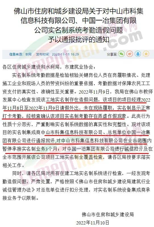 因此,對中山市科集信息科技有限公司、總包單位中國一冶集團(tuán)有限公司進(jìn)行通報批評。對中山市科集信息科技有限公司在全市范圍內(nèi)暫停承接實名制業(yè)務(wù)3個月;對中國一冶集團(tuán)有限公司進(jìn)行誠信扣分及在全市范圍開展該公司項目工地實名制全覆蓋檢查。