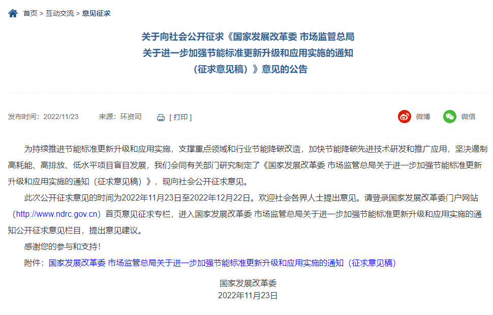 日前,國家發(fā)改委發(fā)布公告,對《國家發(fā)展改革委 市場監(jiān)管總局關于進一步加強節(jié)能標準更新升級和應用實施的通知(征求意見稿)》公開征求意見。