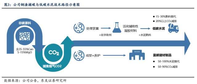 近年來,政策持續(xù)鼓勵鋼渣等大宗固廢在水泥中的利用,鋼渣在水泥行業(yè)中的應用主要有兩個途徑,一是作為鐵質校正劑作生料燒制熟料,應用成熟,但摻量較低,約5%;二是作為混合材磨細生產(chǎn)水泥,通過在通用水泥中摻加少量鋼渣以降低成本,且具有需水量少、燒失量低等特點。因此,公司固碳項目可以有效對鋼渣進行資源化利用,解決鋼鐵企業(yè)鋼渣利用、存儲的難題,實現(xiàn)互利共贏。