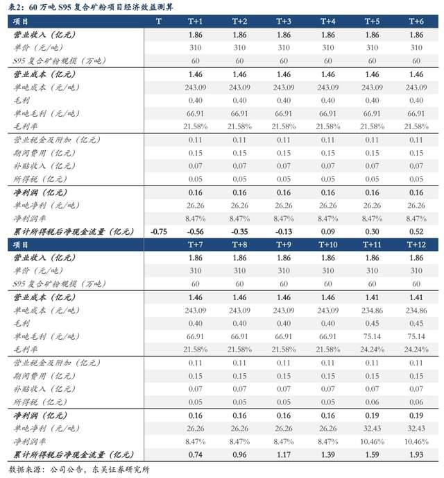 假設公司S95復合礦粉單價為310元/噸,礦粉銷售規(guī)模60萬噸時,預計全年貢獻營業(yè)收入1.86億元,凈利潤1575萬元,毛利率21.58%,凈利率8.47%,稅后內部回報率26.59%,具備較好的經(jīng)濟效益。同時,我們根據(jù)公司已披露的營業(yè)成本拆分里可以看到預計單噸成本在243.09元/噸,其中原材料、燃料及動力費、折舊攤銷費、工資及福利費、修理費占比分別達74%、20%、4%、1%、1%。