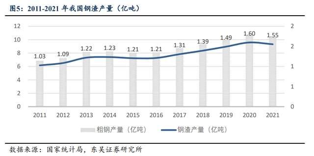 鋼渣資源化利用率僅約35%,鼓勵鋼渣等含鈣資源在水泥中的應用。鋼渣是鋼鐵工業(yè)煉鋼過程中產(chǎn)生的大宗固體伴生物,約占鋼產(chǎn)量的 12%-15%,我們按照15%含量計算,則2021年我國鋼渣產(chǎn)量達1.55億噸。