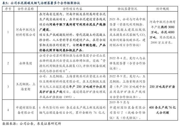 2021年公司與中聯(lián)水泥的母公司河南中聯(lián)同力材料有限公司簽訂合作協(xié)議,約定項目生產(chǎn)低碳膠凝材料(用于生產(chǎn)低碳水泥)、替代混凝土的混凝土摻合料、人工骨料等系列建材產(chǎn)品,在符合國家相關標準的前提下,由河南中聯(lián)同力材料有限公司包銷,且在首條中聯(lián)水泥生產(chǎn)線成功運行后向河南中聯(lián)下屬所有可利用水泥生產(chǎn)線進行推廣建設,據(jù)河南中聯(lián)官網(wǎng)數(shù)據(jù)顯示,目前河南中聯(lián)同力擁有年產(chǎn)能熟料3000萬噸,中聯(lián)水泥首條合作水泥熟料生產(chǎn)線產(chǎn)能為4500t/d,可見若復制至河南中聯(lián)所有生產(chǎn)線潛在空間較大。