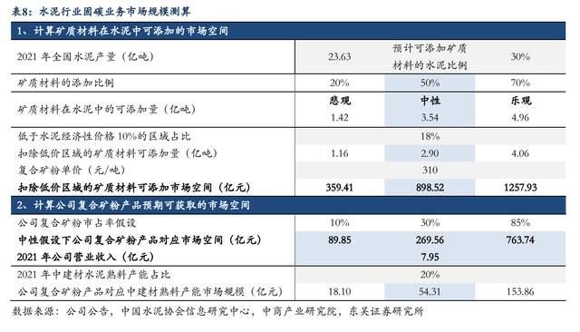 考慮公司光伏主業(yè)景氣度上行,水泥固碳項目進展順利,我們測算在礦粉添加比例50%背景下,公司復合礦粉產(chǎn)品若實現(xiàn)10%、30%、85%市占率時對應的市場空間分別達89.85、269.56、763.74億元,為公司2021年營業(yè)收入的11、34、96倍,潛在成長空間較大。