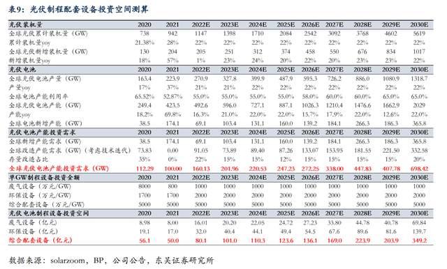 在全球碳減排大背景下,光伏行業(yè)迎來快速增長,我們預計至2030年光伏電池廢氣設備投資空間達69.84億元,綜合配套設備投資空間達349.2億元。