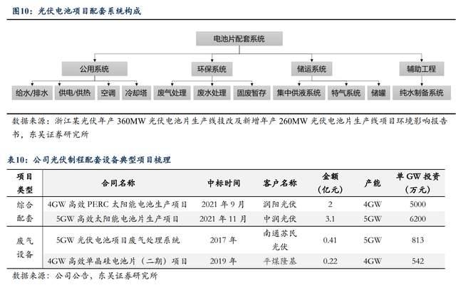 公司于2021年9月和11月接連落地兩個光伏電池綜合配套系統(tǒng)的大單,其單GW價值量分別達到5000萬元及6200萬元。兩個大單的落地驗證了公司向一體化綜合配套設備模式轉變的能力,從公司典型項目合同金額來看,單一的廢氣設備單GW投資金額約500~800萬元,綜合配套設備系統(tǒng)單GW投資金額約5000~6000萬元,則公司在從廢氣設備向一體化配套設備轉型過程中單位價值體量提升空間可達5~11倍。