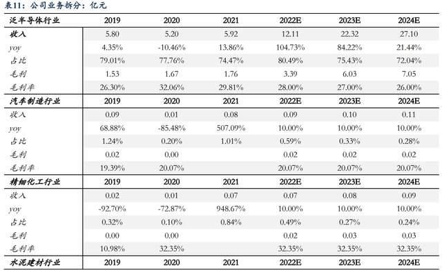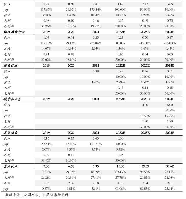占總收入比重較小,假設鋼鐵行業(yè)2022-2024年收入增速為0%/-15%/-15%,假設碳素行業(yè)2022-2024年收入增速為10%/10%/10%,假設汽車制造、精細化工及其他行業(yè)2022-2024年收入增速維持10%左右增速,毛利率與過去三年趨勢保持一致