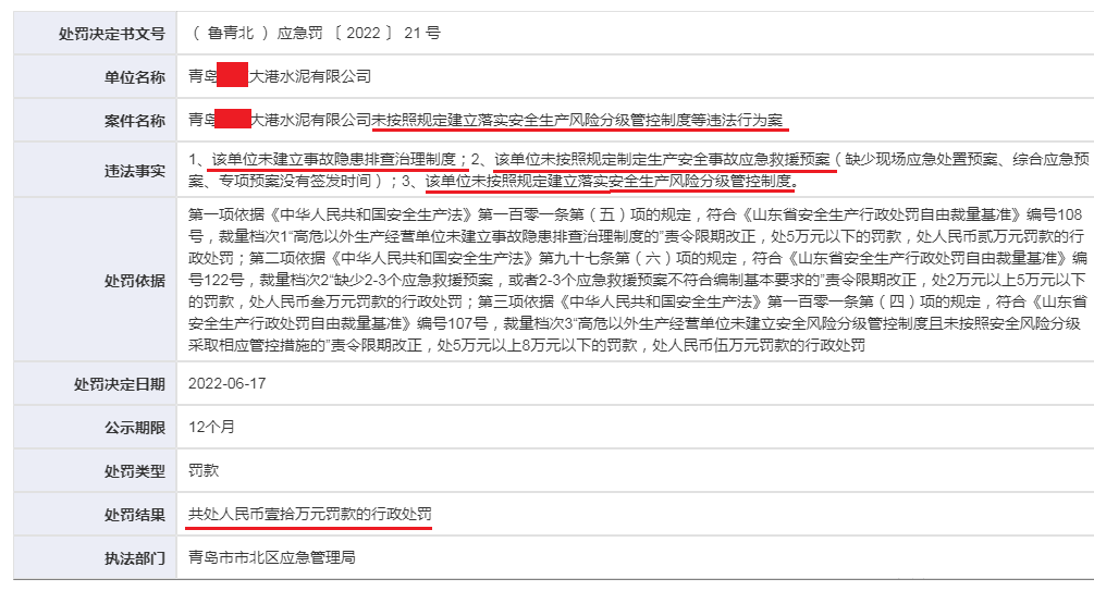 據(jù)青島市市北區(qū)應急管理局的處罰決斷書,對青島某水泥有限公司未按照規(guī)定建立生產(chǎn)風險分級管控制度等行業(yè)案作出罰款10萬元的行政處罰。