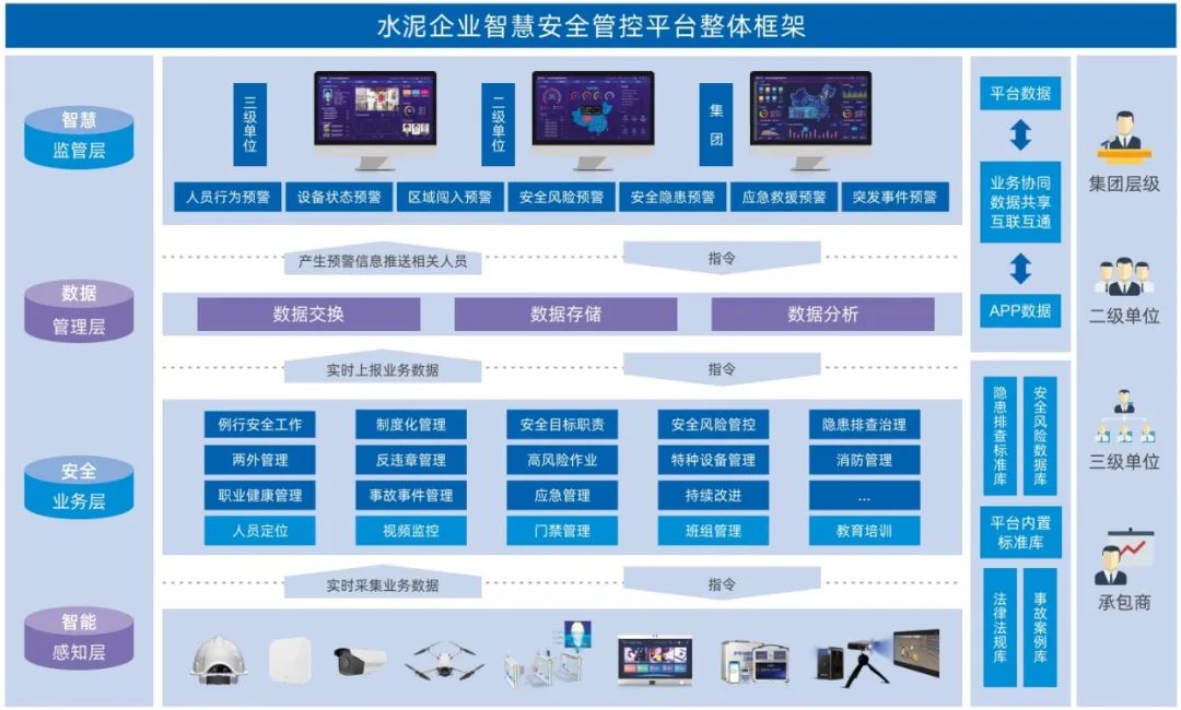 水泥企業(yè)智慧安全管控平臺,以雙重預防機制和安全生產(chǎn)標準化為核心,采用“平臺+移動APP+智能終端”的創(chuàng)新管理模式,對企業(yè)安全風險及隱患排查等重要環(huán)節(jié)采用動態(tài)閉環(huán)式管控,協(xié)助水泥企業(yè)構建集團、二級單位、三級單位等多層級的安全管控模式,融合三維地圖、人車定位、智能視頻監(jiān)控、智能門禁等智能軟硬件設施,實現(xiàn)水泥企業(yè)安全工作的關口前移、精準監(jiān)控、源頭治理、科學預防和智能化管控,從而加強對水泥企業(yè)生產(chǎn)過程中安全風險進行全面有效管控。