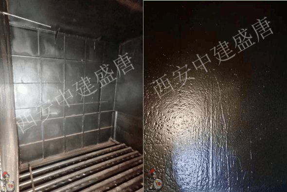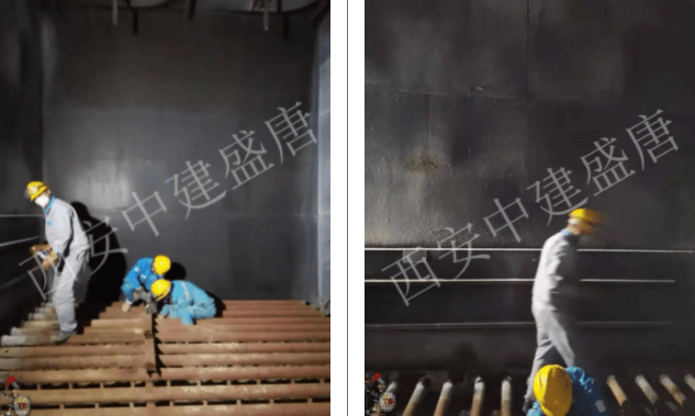 2020年7月,西安中建盛唐首先對(duì)水泥廠的二線窯尾收塵器內(nèi)壁腐蝕部位使用TD104#石墨烯防腐涂料進(jìn)行防腐施工。在使用3個(gè)多月后,對(duì)窯尾袋收塵氣室運(yùn)行情況進(jìn)行檢查,效果良好:檢查 10 個(gè)凈氣室5個(gè)面防腐涂料防腐效果良好,完整無腐蝕脫落現(xiàn)象;10個(gè)凈氣室東、西側(cè)及頂部三個(gè)面結(jié)晶現(xiàn)象較嚴(yán)重,清理結(jié)晶物后,防腐層完整,未滲透防腐涂料,防腐效果良好。
