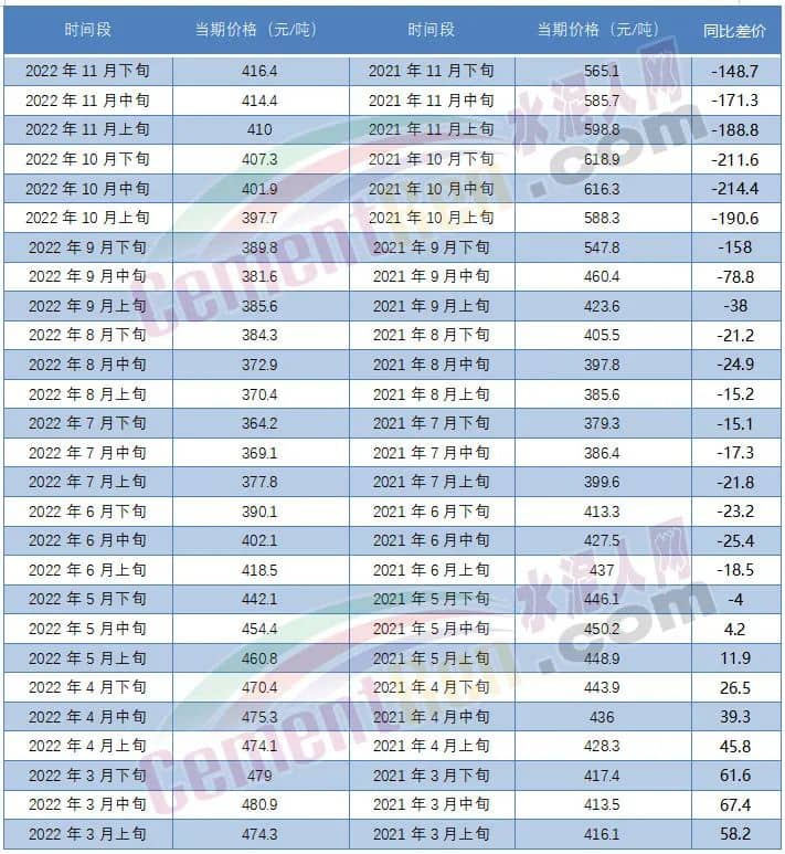 2022年以來,水泥價格波動頻繁,流通領(lǐng)域P.O42.5散裝水泥報價自5月下旬以來,同比2021年卻一直處于低位。10月中下旬同比差價達到200元/噸以上,11月下旬同比上年同期差價148.7元/噸。