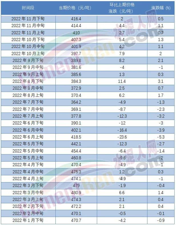 從2022年1月至今數(shù)據(jù)來看,6月上旬水泥價格直跌23.6元/噸,跌幅5.3%,為年內(nèi)最大跌幅。8月下旬環(huán)比上漲11.4元/噸,漲幅3.1%,跌多漲少。且3月下旬至7月下旬一直處于環(huán)比下跌狀態(tài)。盡管從8月上旬至今水泥價格一直趨于上漲通道,但是11月下旬的報價仍較今年1月下旬要低54.3元/噸,最高報價3月中旬480.9元/噸,最低價為7月下旬364.2元/噸,差價116.7元/噸。