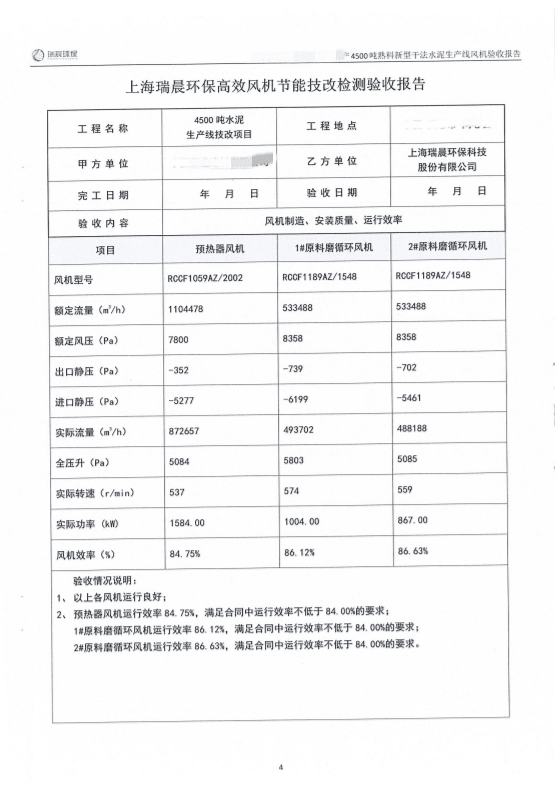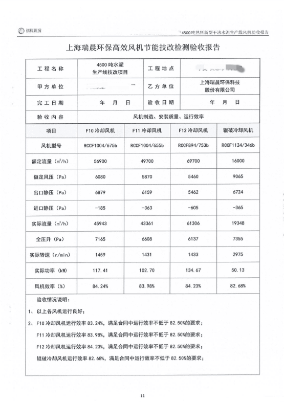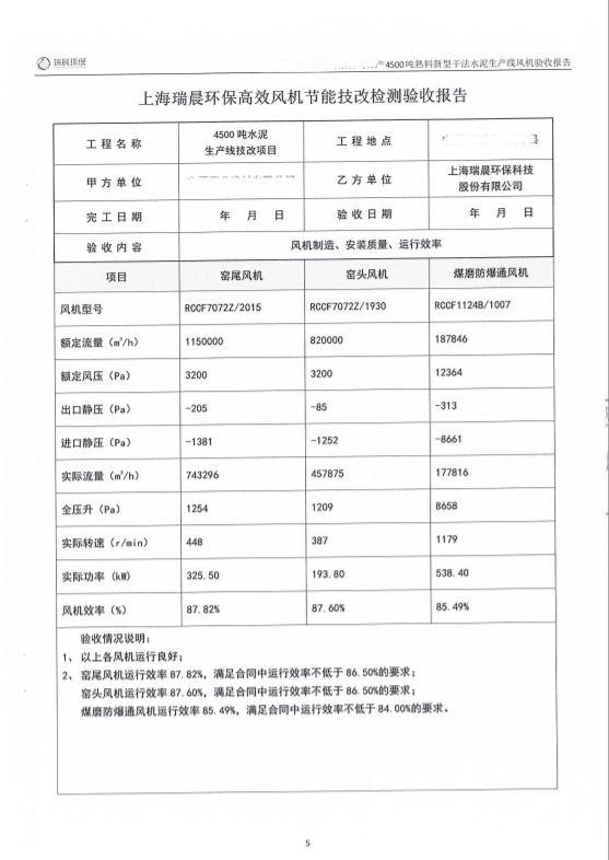 2022年8月,該水泥企業(yè)組織雙方共同對全線風機進行了聯(lián)合驗收測試。測試結果顯示,風機運行良好,實測效率優(yōu)于合同約定效率,達到雙方約定的驗收指標,風機單耗低,使用效果好。