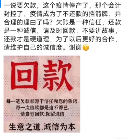有網(wǎng)友表示,疫情成了不還款的擋箭牌。一說要欠款就說停產(chǎn)了,會(huì)計(jì)封控了。疫情是暫時(shí)的,信譽(yù)是長久的,大家都在疫情中,都很艱難。