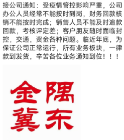 金隅冀東某公司因公司通知,受疫情影響,辦公室人員經(jīng)常不能按時(shí)到崗,財(cái)務(wù)回款核銷不能按照完成,銷售人員不能及時(shí)追款回款,考核評(píng)定差,客戶朋友又隨時(shí)面臨封控,交通,資金各種問題,臨近年底,為保證公司正常運(yùn)行,所有業(yè)務(wù)板塊一律款到發(fā)貨。