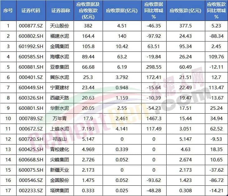 海螺水泥應(yīng)收賬款同比增加超100%,萬年青應(yīng)收票據(jù)大增1467.3%