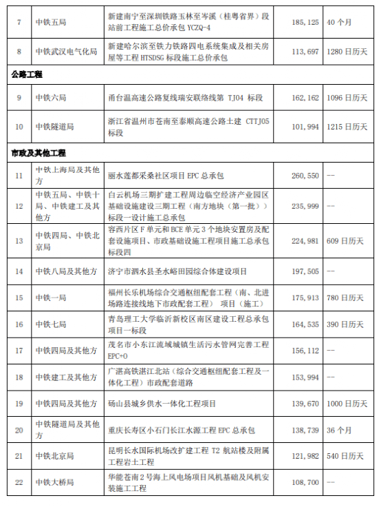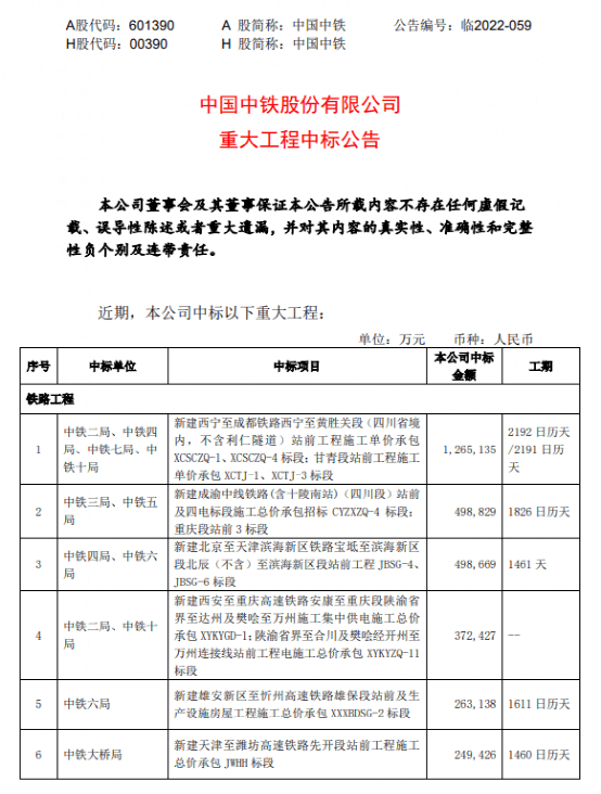 中國中鐵中標(biāo)價(jià)合計(jì)約人民幣589億元,約占公司2021年?duì)I業(yè)收入的5.51%。