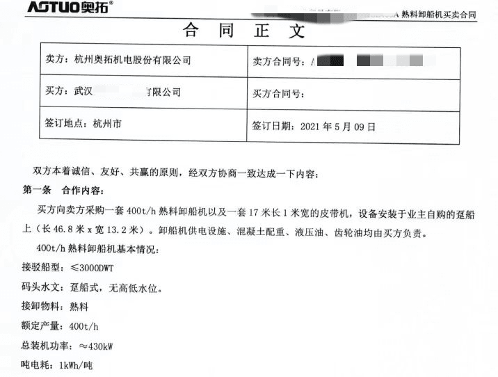 該企業(yè)負(fù)責(zé)人對水泥人網(wǎng)表示,2021年,他們從杭州奧拓機(jī)電股份有限公司(以下簡稱“奧拓股份”)采購了一套環(huán)保熟料卸船機(jī)和一套皮帶輸送機(jī),卸船機(jī)額定生產(chǎn)率400噸/小時(shí),據(jù)悉該類型熟料卸船機(jī)最大生產(chǎn)率可達(dá)1500噸/小時(shí),最大可卸載10萬噸級散貨船。