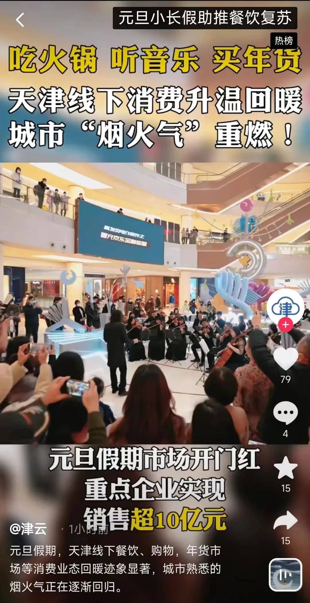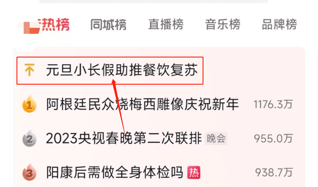 近日,“元旦小長(zhǎng)假助推餐飲復(fù)蘇”登上了熱榜。陜西全省餐飲收入同比增長(zhǎng)6成,天津元旦假期重點(diǎn)企業(yè)實(shí)現(xiàn)銷(xiāo)售超10億元,楊州望月路、國(guó)慶路上的店鋪回到了往日的喧鬧……