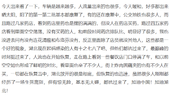 有網(wǎng)友在媒體平臺(tái)發(fā)消息稱,陽(yáng)的第一第二批基本康復(fù)了,有的還在康復(fù)中,公交地鐵有很多人,路過(guò)幾家藥店,看到除了店員沒(méi)有其他人,餐飲店門(mén)口停滿了車(chē),街上炸肉圓藕夾的也有不少人在買(mǎi),一切都在恢復(fù)當(dāng)中。