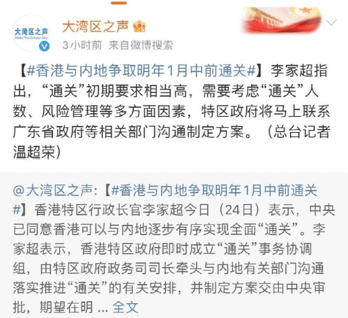 香港特區(qū)行政長(zhǎng)官李家超于2022年12月24日表示,中央已同意香港可以與內(nèi)地逐步有序?qū)崿F(xiàn)全面“通關(guān)”。李家超表示,香港特區(qū)政府即時(shí)成立“通關(guān)”事務(wù)協(xié)調(diào)組,由特區(qū)政府政務(wù)司司長(zhǎng)牽頭與內(nèi)地有關(guān)部門(mén)溝通落實(shí)推進(jìn)“通關(guān)”的有關(guān)安排,并制定方案交由中央審批,期望在2023年1月中之前逐步有序落實(shí)。