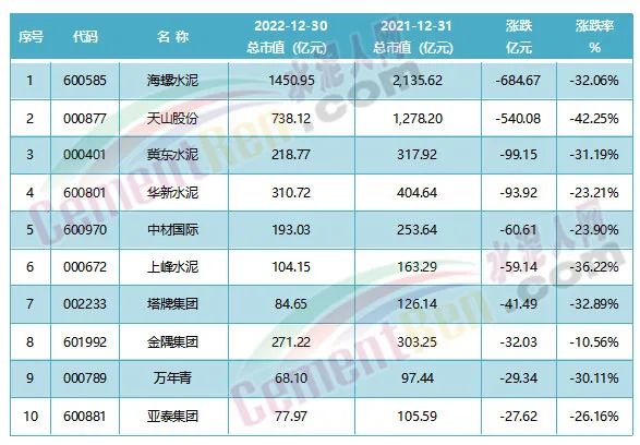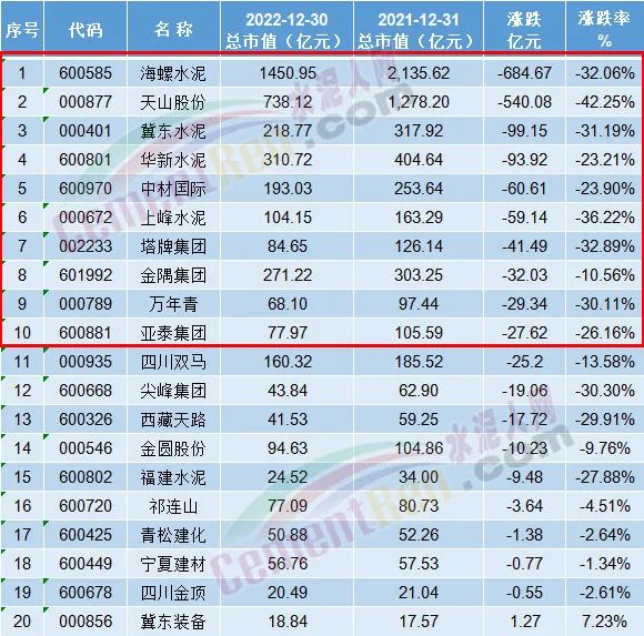 從水泥行業(yè)A股20家主流上市公司來看,市值蒸發(fā)達一千多億。