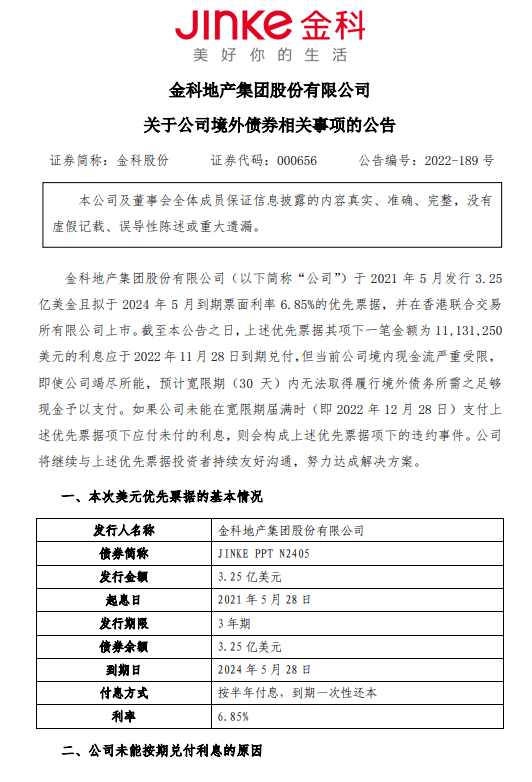 12月28日,金科股份公告稱,一筆金額約1113.125萬美元的利息應于 2022年11月28日到期兌付,但當前公司境內(nèi)現(xiàn)金流嚴重受限,即使公司竭盡所能,預計寬限期30天內(nèi)無法取得履行境外債務所需之足夠現(xiàn)金予以支付。