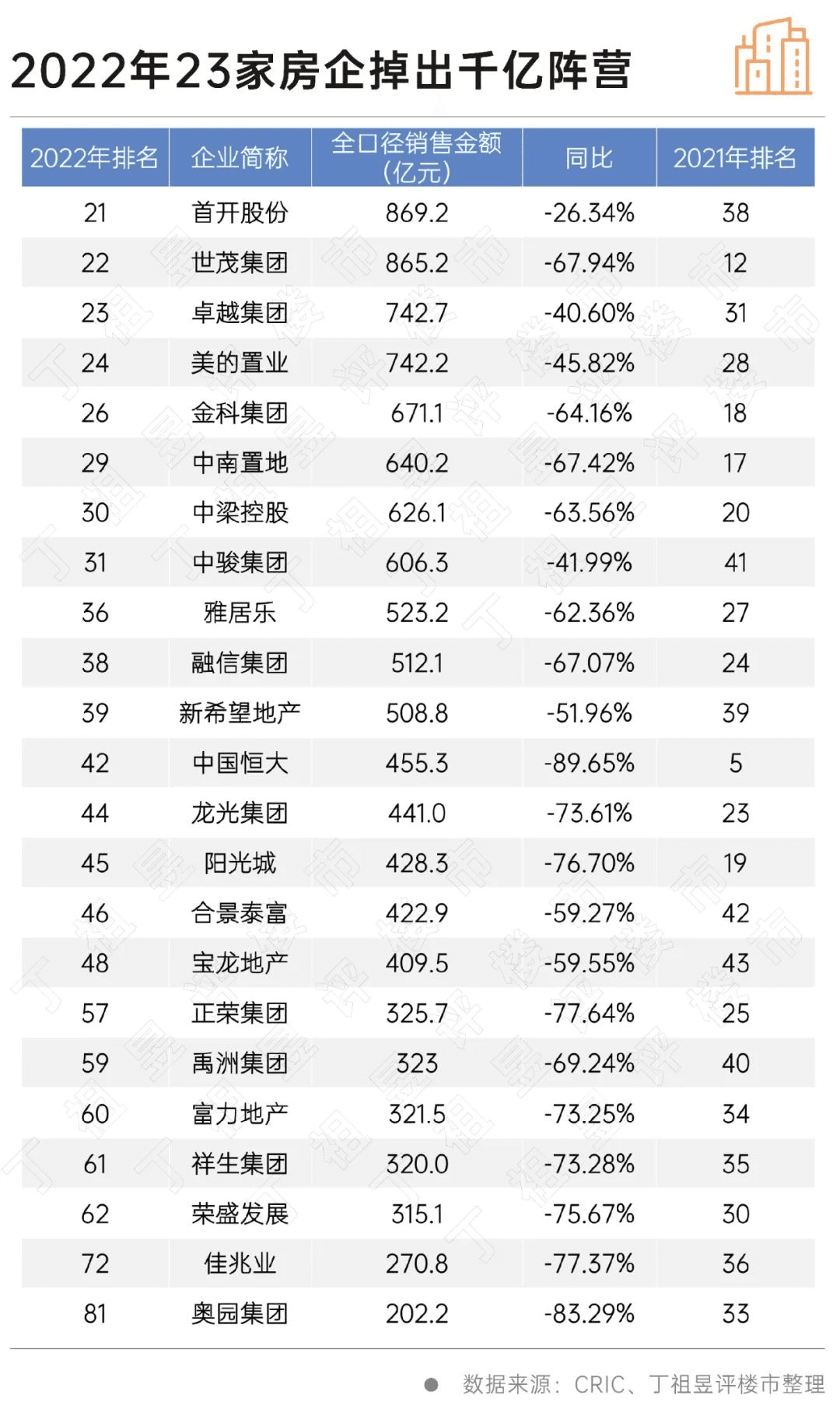 此外,綠地控股、新城控股等4家房企全年業(yè)績縮水50%以上。從千億房企排名變化來看,前十房企已明顯洗牌,融創(chuàng)和綠地已被擠出前十。