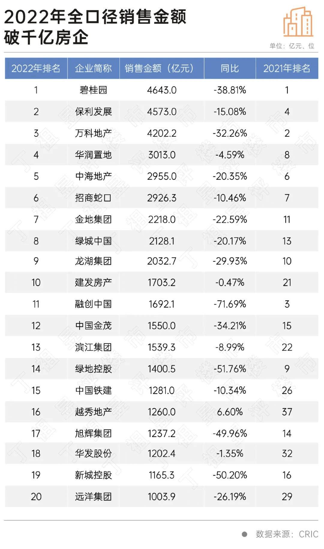 據(jù)水泥人網(wǎng)了解,2022年,多數(shù)規(guī)模房企深陷負增長困局,百強房企全年業(yè)績有九成下滑。2022年成為房企洗牌年,最明顯的標志是,千億房企數(shù)量銳減一半。