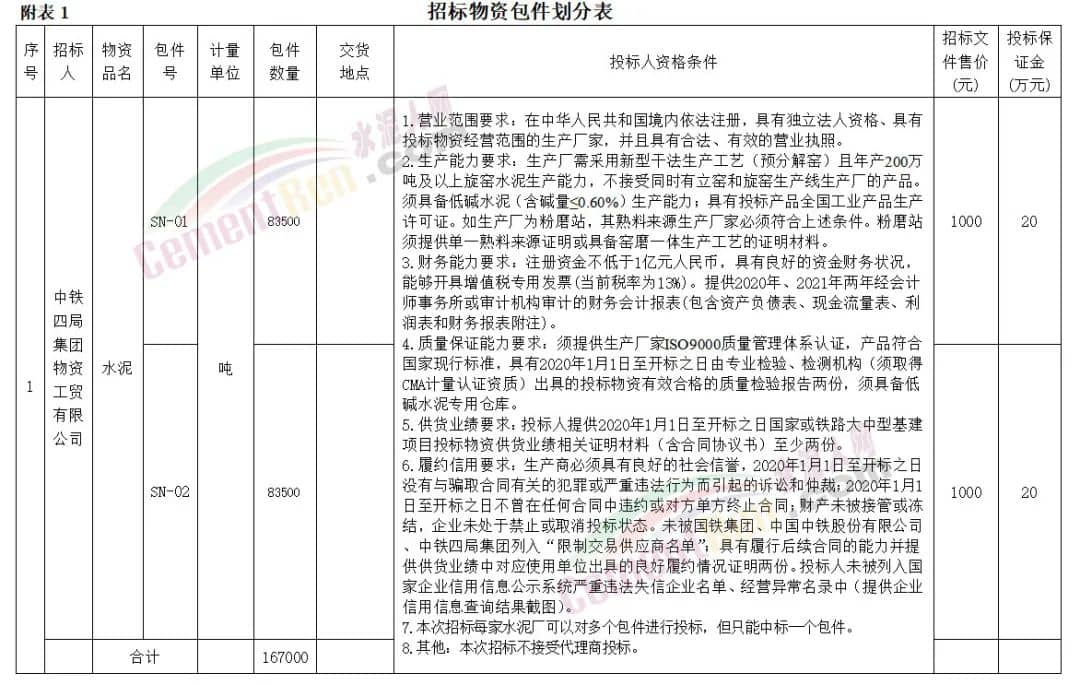 注冊資金不低于1億元人民幣,具有良好的資金財務(wù)狀況,能夠開具增值稅專用發(fā)票(當前稅率為13%)。投標人需提供2020年1月1日至開標之日國家或鐵路大中型基建項目投標物資供貨業(yè)績相關(guān)證明材料至少兩份。本次招標每家水泥廠可以對多個包件進行投標,但只能中標一個包件,本次招標不接受代理商投標。