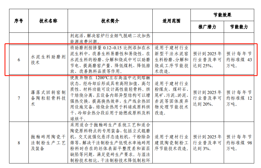 為加快推廣應(yīng)用先進(jìn)適用節(jié)能技術(shù)裝備,促進(jìn)企業(yè)節(jié)能降碳、降本增效,工信部近日發(fā)布了《國(guó)家工業(yè)和信息化領(lǐng)域節(jié)能技術(shù)裝備推薦目錄(2022年版)》,湖南昌迪環(huán)境科技有限公司(以下簡(jiǎn)稱“湖南昌迪”)申報(bào)的水泥生料助磨劑應(yīng)用技術(shù)納入建材行業(yè)節(jié)能提效技術(shù)裝備推薦。