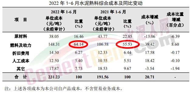 煤價(jià)上漲導(dǎo)致包括海螺水泥在內(nèi)的能源消費(fèi)大戶成本上漲,海螺水泥2022年半年報(bào)顯示,燃料及動(dòng)力占費(fèi)用成本的64%,而且呈增長的趨勢。2020年的燃料成本占比為53%,2021年是55%。