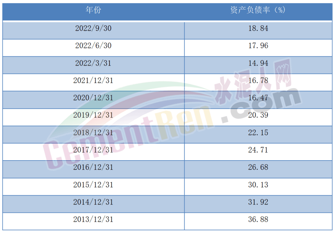 從企業(yè)資產(chǎn)負(fù)債率來看,從2013年開始海螺水泥的資產(chǎn)負(fù)債率逐年下降,2022年第三季度僅為18.84%,作為一個(gè)重資產(chǎn)的水泥企業(yè),市值過千億,這么低的負(fù)債實(shí)屬不易。