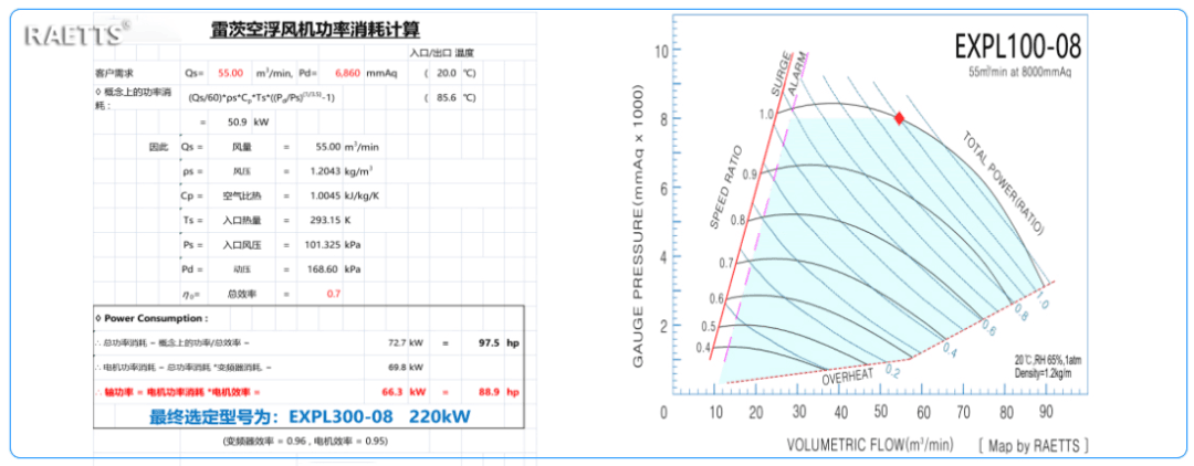 改造前使用的三葉羅茨風(fēng)機(jī)工作狀態(tài)為1用0備,常開,運行時間為24h/d連續(xù)運行,根據(jù)設(shè)備工況,該水泥企業(yè)的核算選型如下圖所示: