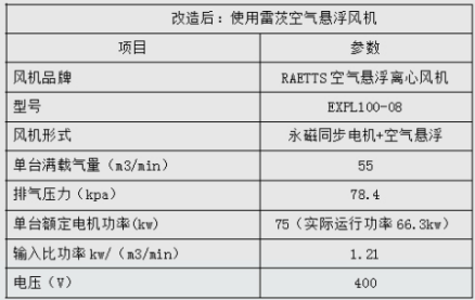 根據(jù)用能單位的現(xiàn)場實際情況,采用高速永磁變頻空氣懸浮離心風(fēng)機(jī)情況風(fēng)量:55m³/min;壓力:78.4kPa;電機(jī)實際功率:66.3x1=66.3kW(實際運行功率64.5kW);比功率:1.21kW(m³/min)。