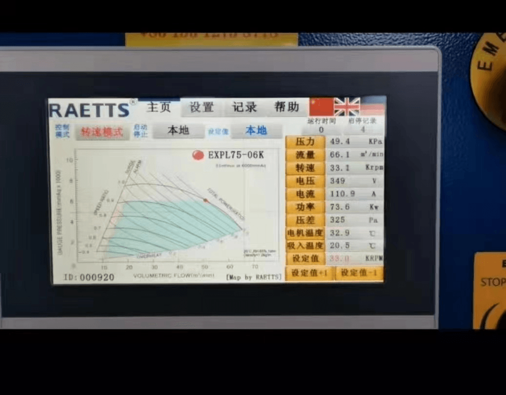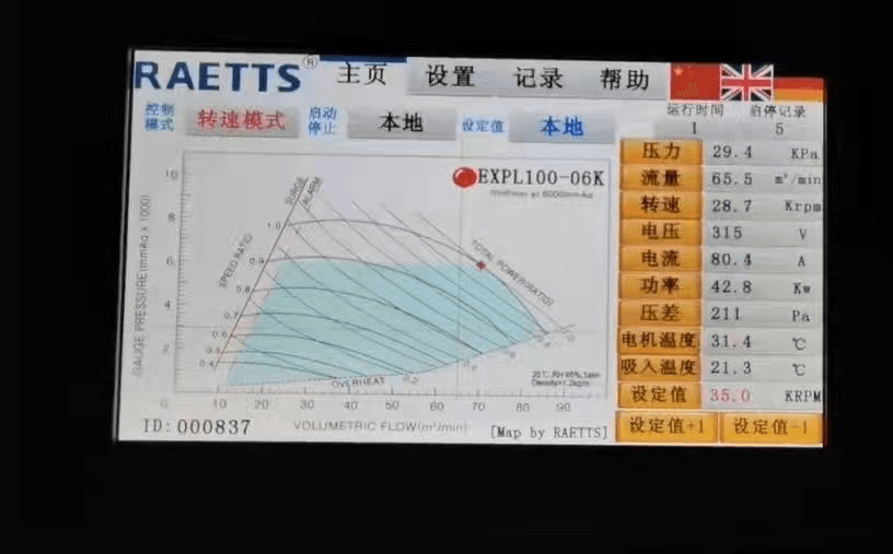 系統(tǒng)情況如下:風(fēng)量:55x1=55m³/min;壓力:68.6kPa;電機(jī)功率:105x1=105kW(實際運行功率105kW);比功率:105:55=1.91kW(m³/min)。
