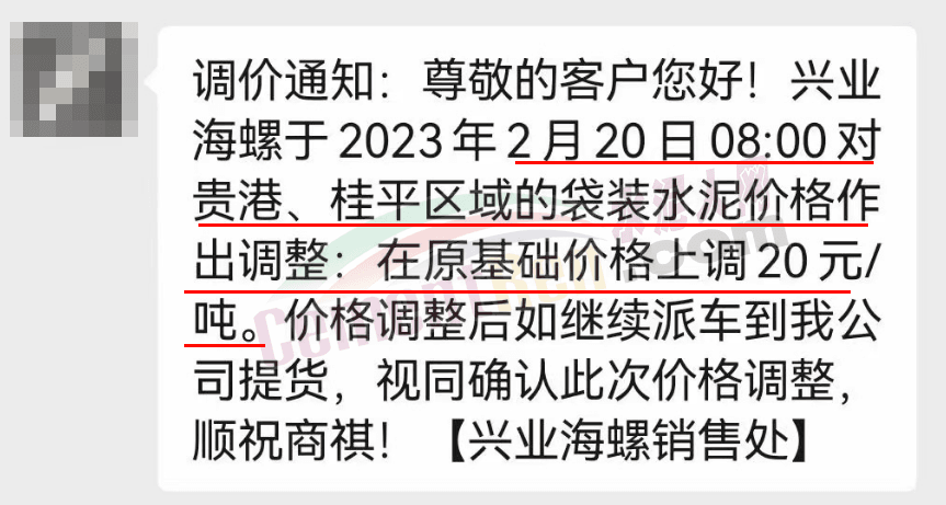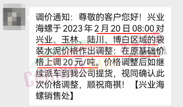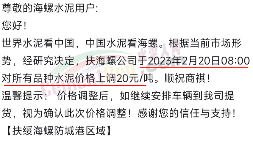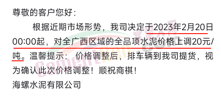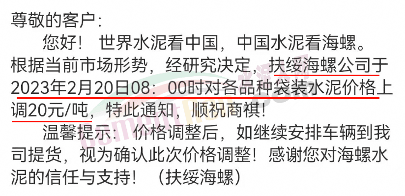 海螺水泥通知,于2月20日0時(shí)起,對(duì)廣西區(qū)域全品項(xiàng)水泥價(jià)格上調(diào)20元/噸。并提示,價(jià)格調(diào)整后,若繼續(xù)安排車(chē)輛提貨,視為確認(rèn)此次價(jià)格調(diào)整。