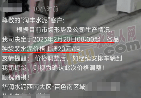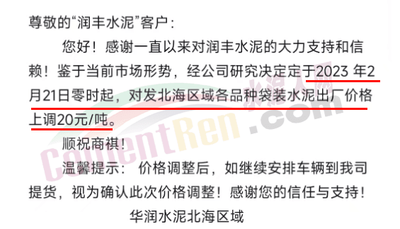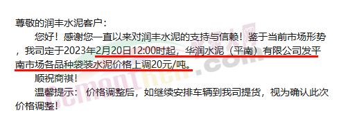華潤(rùn)水泥(平南)有限公司通知,定于2023年2月20日12:00時(shí)起發(fā)平南市場(chǎng)各品種袋裝水泥價(jià)格上調(diào)20元/噸。