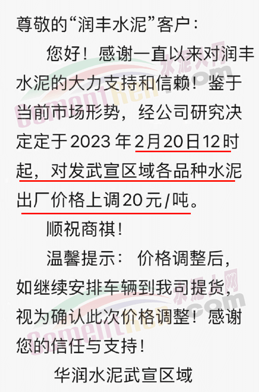 華潤(rùn)水泥武宣區(qū)域通知,定于2月20日12時(shí)起,對(duì)發(fā)武宣區(qū)域各品種水泥出廠價(jià)格上調(diào)20元/噸。