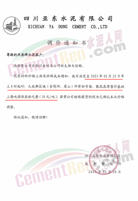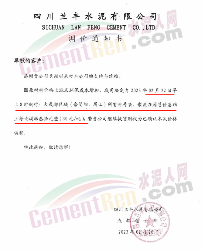 同期,四川蘭豐水泥、亞?wèn)|水泥分別通知,2月22日早8時(shí)起,大成都區(qū)域所有標(biāo)號(hào)水泥上調(diào)30元/噸。