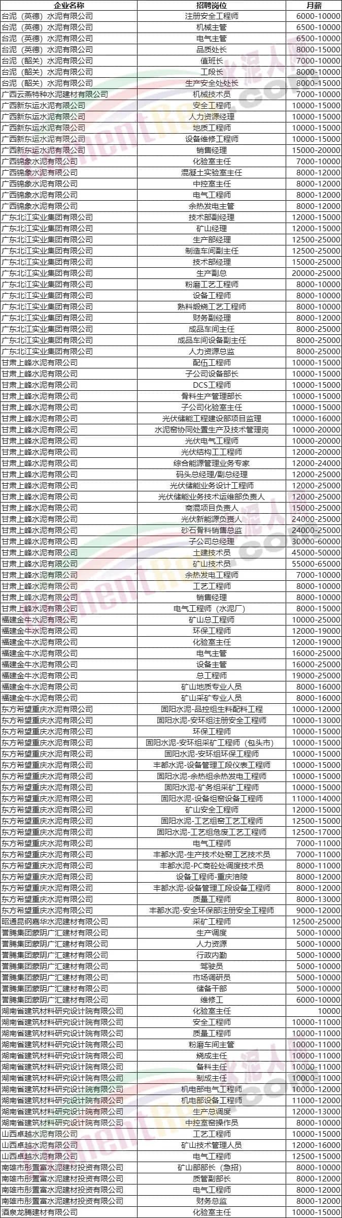 水泥人網(wǎng)注意到,上述招聘企業(yè)中廣西錦象水泥有限公司、甘肅上峰水泥有限公司、福建金牛水泥有限公司、酒泉龍騰建材有限公司、湖南省建筑材料研究設(shè)計(jì)院有限公司等五家企業(yè)招聘化驗(yàn)室主任,薪資在7000-19000元/月。