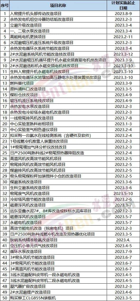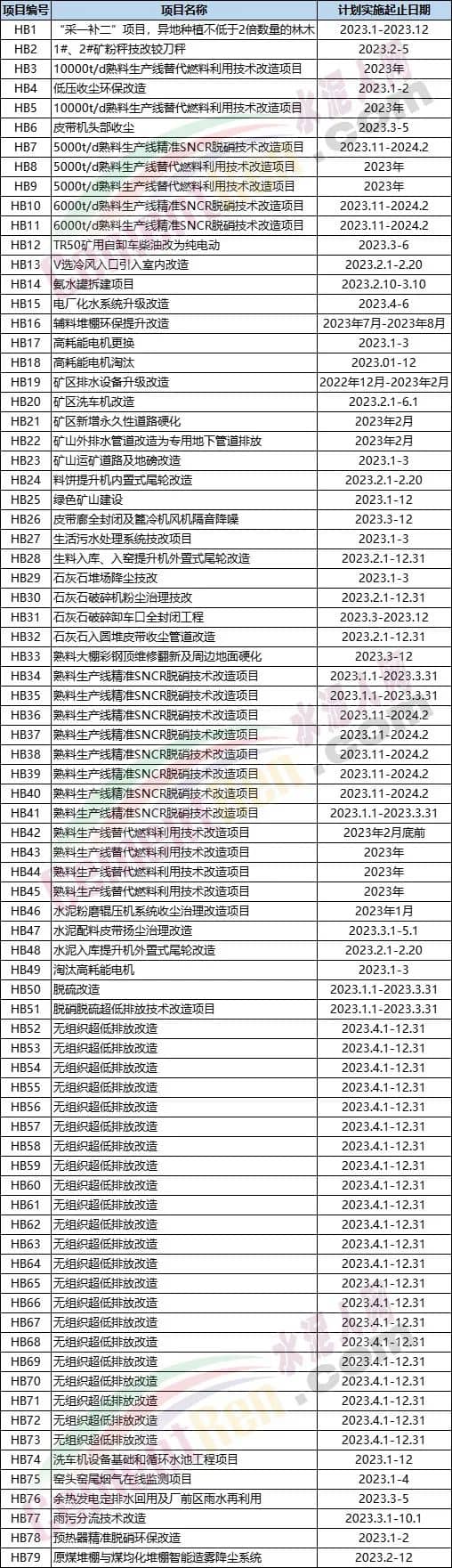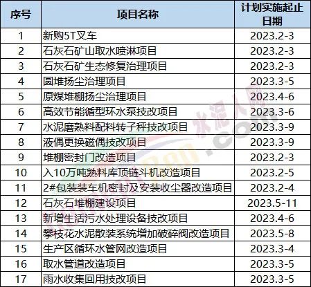 環(huán)保類技改項目涉及低壓收塵環(huán)保改造、精準SNCR脫硝、脫硝系統(tǒng)升級改造、無組織超低排放改造 、高耗能電機淘汰、粉磨系統(tǒng)技改、替代燃料技改、綠色礦山建設以及堆場降塵、破碎機揚塵治理、粉塵治理、循環(huán)水再利用、脫硫改造、氯水罐拆建、配料皮帶揚塵治理、提升機改造、V選冷風機改造、皮帶廊全封閉、篦冷機隔音降噪改造、大棚翻新、地面硬化、煙氣在線監(jiān)測系統(tǒng)、原煤及煤均化棚造霧降塵系統(tǒng)、礦山取水噴淋項目、礦生態(tài)修復治理項目等。