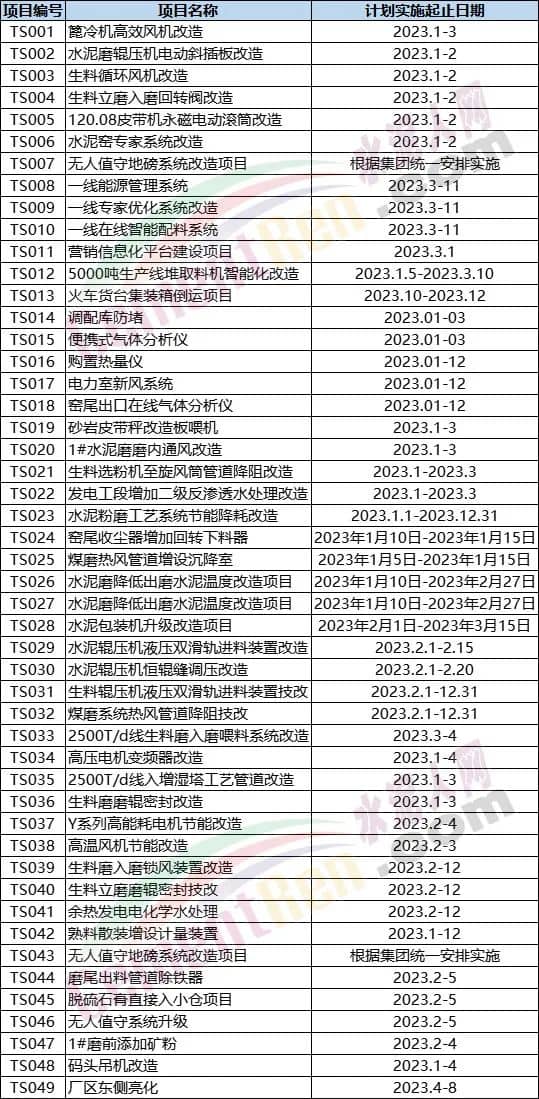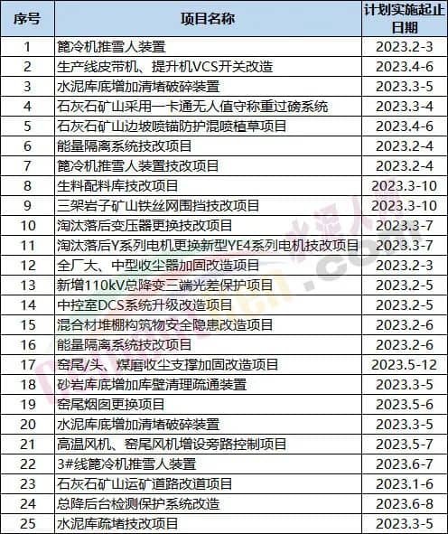 安全類項目涉及變頻器升級、皮帶廊加固、頭尾煤轉子秤控制系統(tǒng)、變頻器水冷系統(tǒng)、安全監(jiān)控網絡系統(tǒng)、高溫風機改造、火災檢測與自動報警裝置、窯尾收塵器技改、煤粉制備防爆系統(tǒng)、原煤輸送系統(tǒng)及煤粉制備系統(tǒng)防爆電機改造、篦冷機推雪人裝置、生產線皮帶機、提升機VCS開關改造、水泥庫底增加清堵破碎裝置、石灰石礦山采用一卡通無人值守稱重過磅系統(tǒng)、石灰石礦山邊坡噴錨防護混噴植草項目、能量隔離系統(tǒng)技改項目、生料配料庫技改項目、淘汰落后變壓器更換技改項目、全廠大、中型收塵器加固改造項目、中控室DCS系統(tǒng)升級改造項目改造項目、混合材堆棚構筑物安全隱患改造項目、水泥庫底增加清堵破碎裝置、高溫風機、窯尾風機增設旁路控制項目、石灰石礦山運礦道路改道項目、總降后臺檢測保護系統(tǒng)改造、水泥庫疏堵技改項目以及礦山基建項目等。