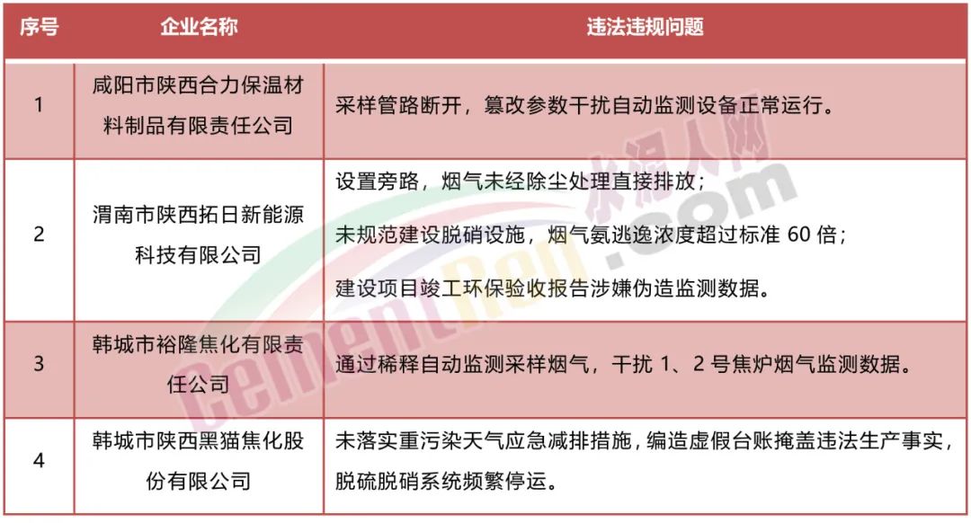 2月21日~22日,生態(tài)環(huán)境部副部長(zhǎng)趙英民帶隊(duì)赴陜西省咸陽(yáng)市、渭南市和韓城市等空氣質(zhì)量明顯反彈城市監(jiān)督幫扶,對(duì)涉氣重點(diǎn)企業(yè)開(kāi)展“四不兩直”督導(dǎo)檢查發(fā)現(xiàn)4家企業(yè)問(wèn)題突出: