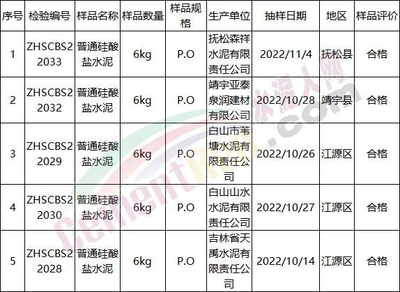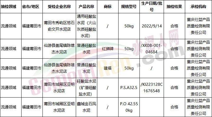 福建省莆田市2022年流通領(lǐng)域建材及裝飾裝修產(chǎn)品類商品質(zhì)量市級監(jiān)督抽查,水泥產(chǎn)品抽查5個批次全部合格。